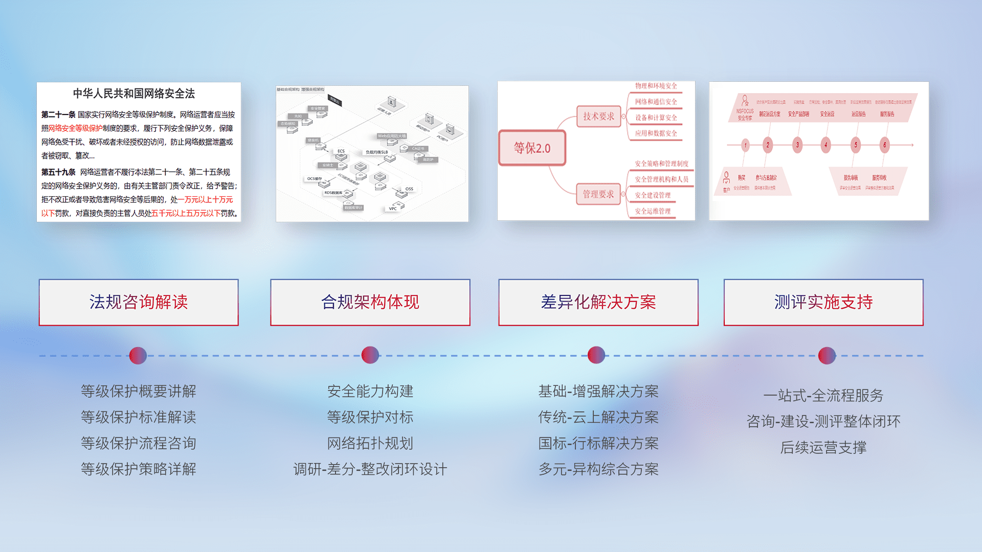 通过专业的法律咨询解读、、合规架构体现、、、、差异化解决方案、、、测试实施支持等服务,,,,为客户量身打造等保合规体系。。